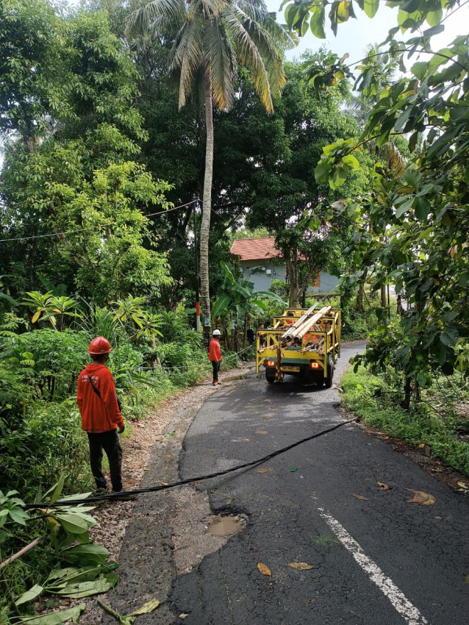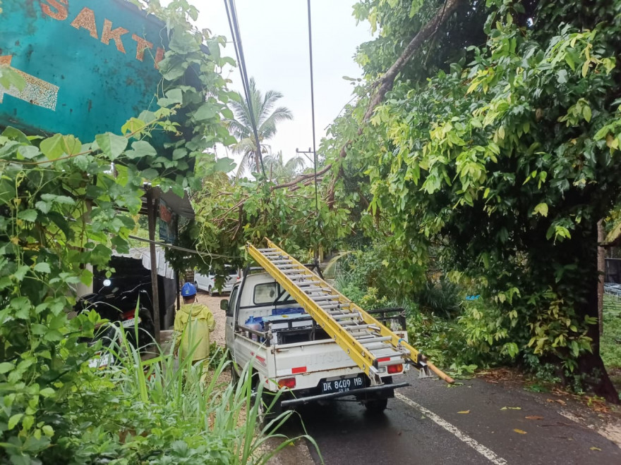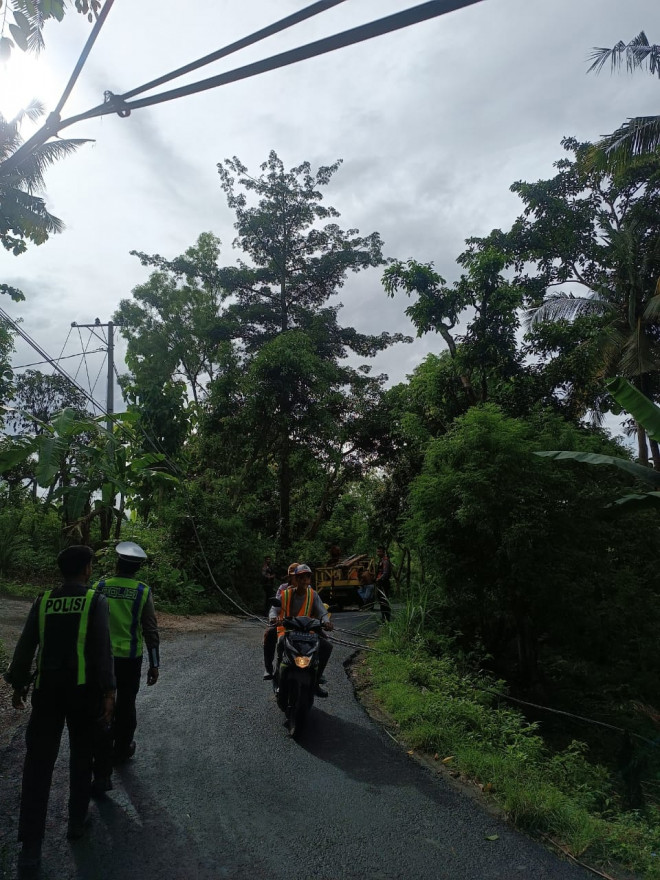 Personel Polsek Nusa Penida turun langsung ke lokasi untuk mengamankan area serta membantu memperlancar arus lalu lintas, sementara petugas terkait melakukan perbaikan jaringan listrik dan pembersihan material pohon tumbang.